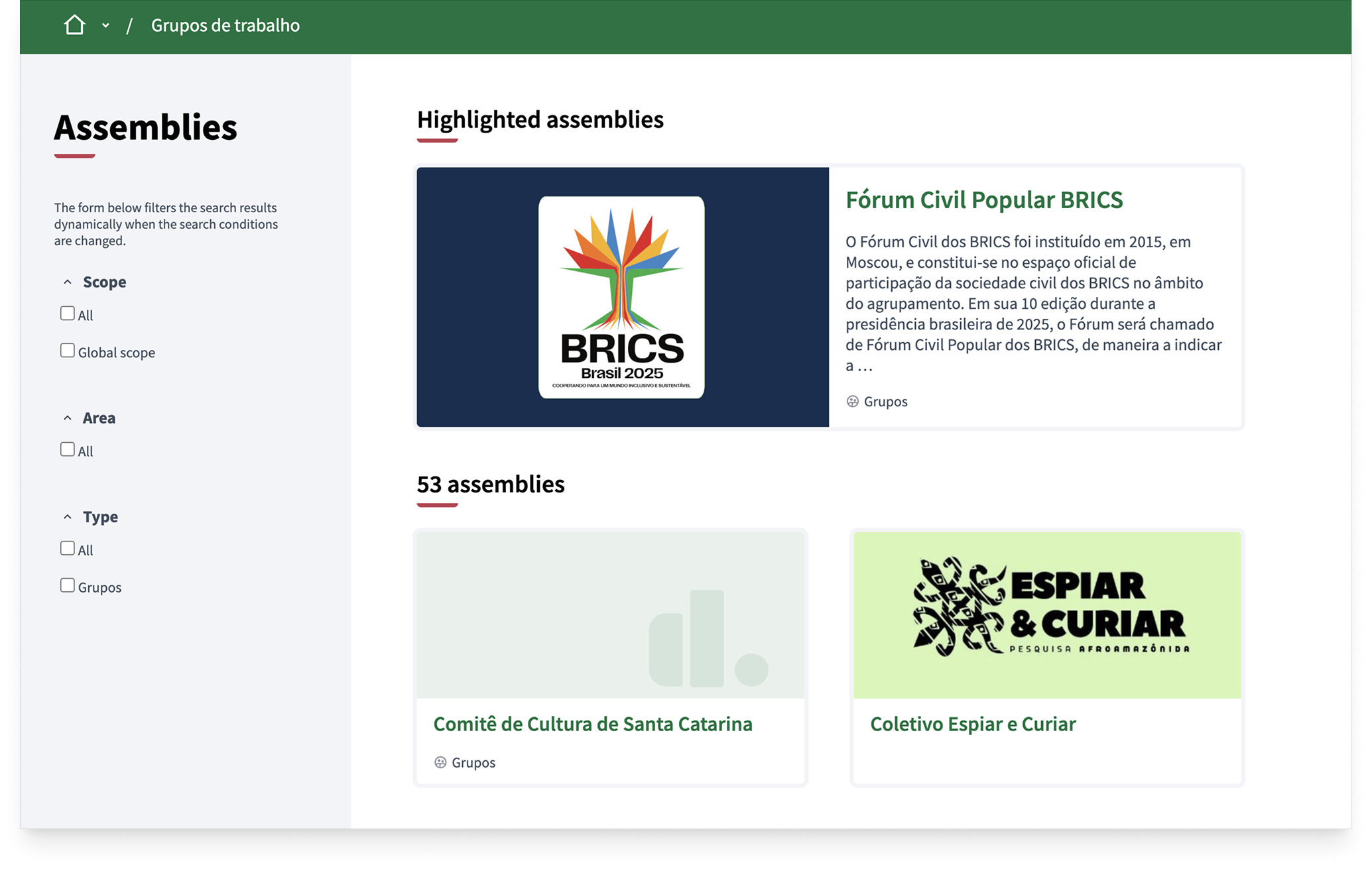 The Confluências Amazônicas working group is composed of 13 indigenous, quilombola, and riverside representatives, each representing a state of the Legal Amazon. In addition to receiving technopolitical training, they also participate in training on the use of social participation platforms, and each of the leaders aims to organize working groups (assemblies) and develop modes of collaborative participation and governance in their territory.